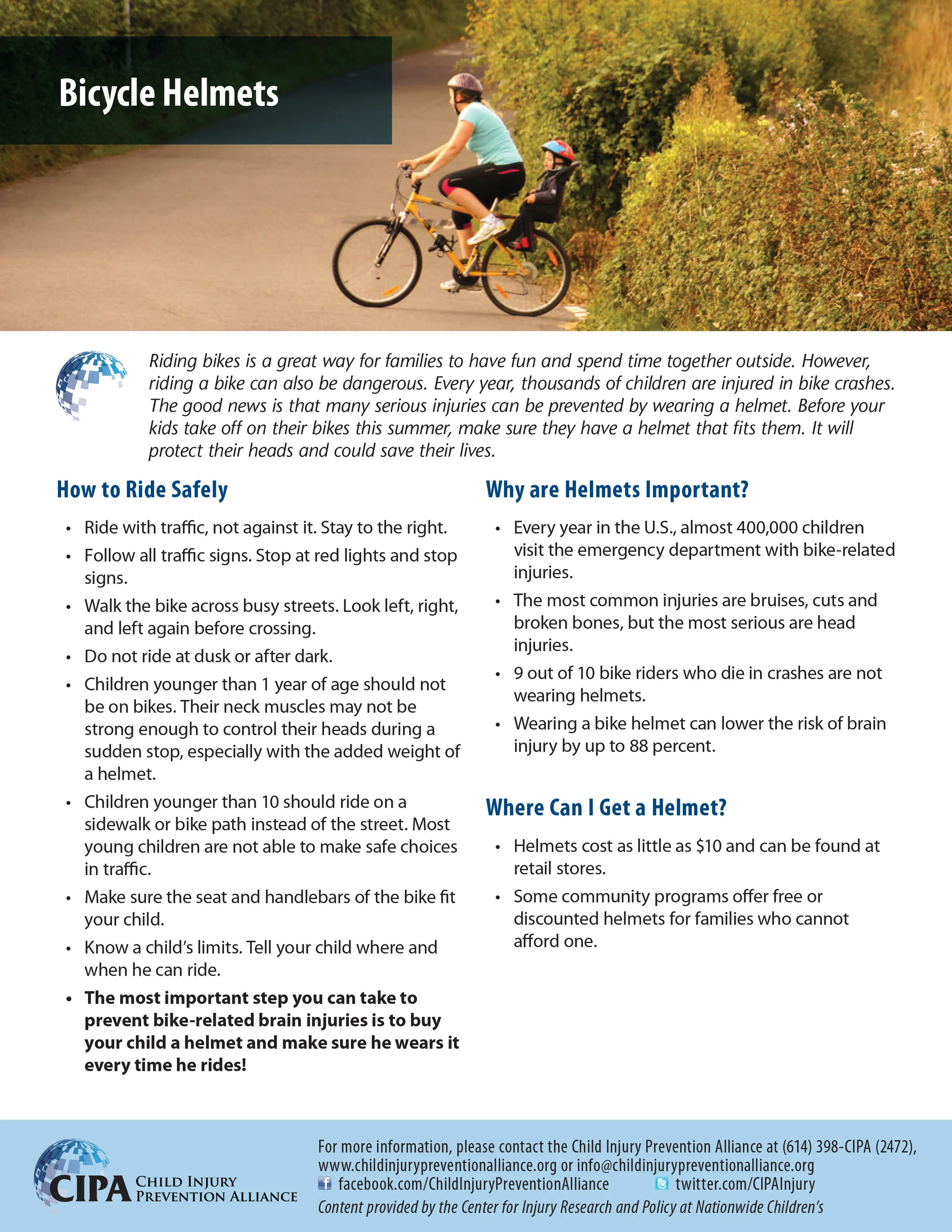 Riding bikes is a great way for families to have fun and spend time together outside. However, riding a bike can also be dangerous. Every year, thousands of children are injured in bike crashes. The good news is that many serious injuries can be prevented by wearing a helmet. Before your kids take off on their bikes this summer, make sure they have a helmet that fits them. It will protect their heads and could save their lives.