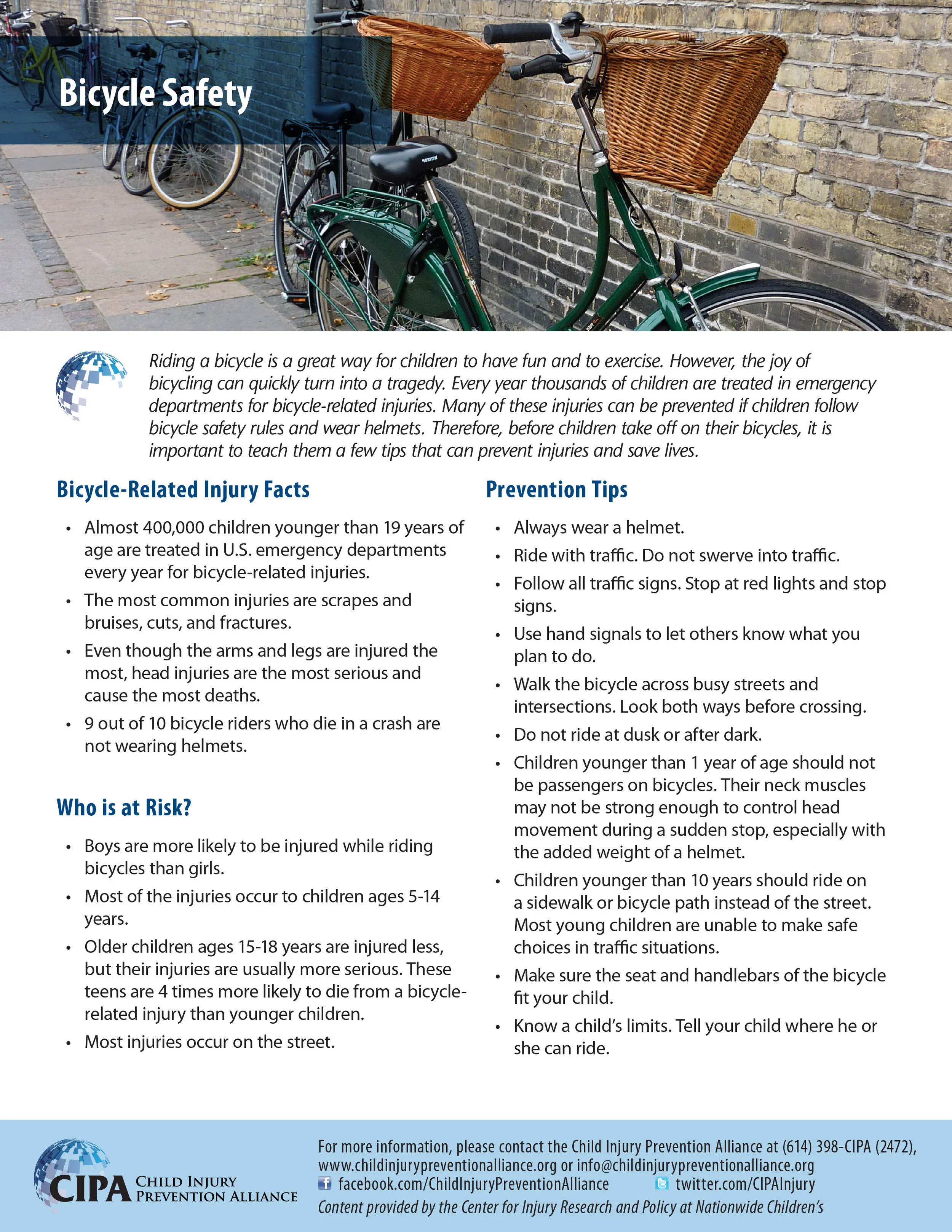 Riding a bicycle is a great way for children to have fun and exercise. However, the joy of bicycling can quickly turn into a tragedy. Every year thousands of children are treated in emergency departments for bicycle-related injuries. Many of these injuries can be prevented if children follow bicycle safety rules and wear helmets. Therefore, before children take off on their bicycles, it is important to teach them a few tips that can prevent injuries and save lives.