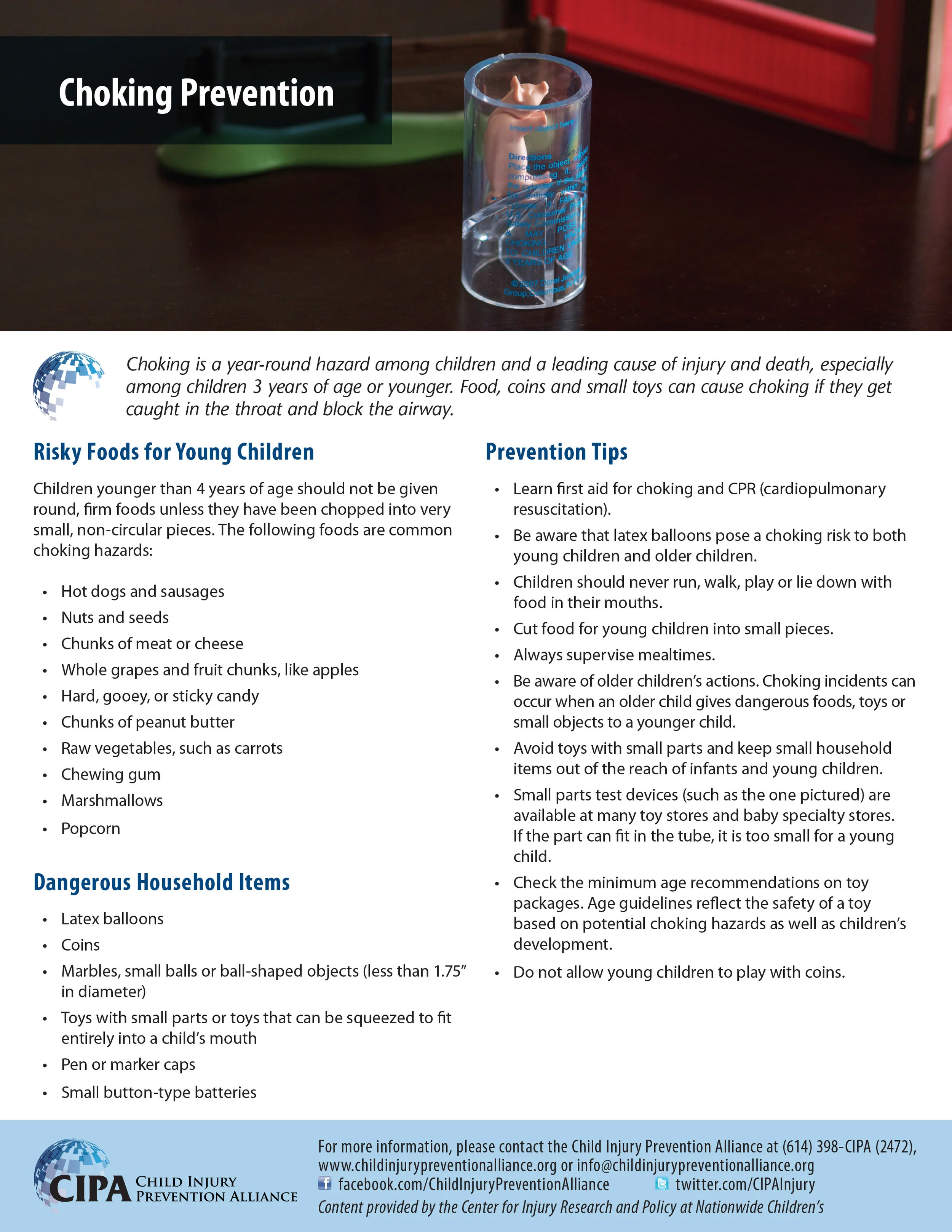 Choking is a year-round hazard among children and a leading cause of injury and death, especially among children 3 years of age or younger. Food, coins, and small toys can cause choking if they get caught in the throat and block the airway.
