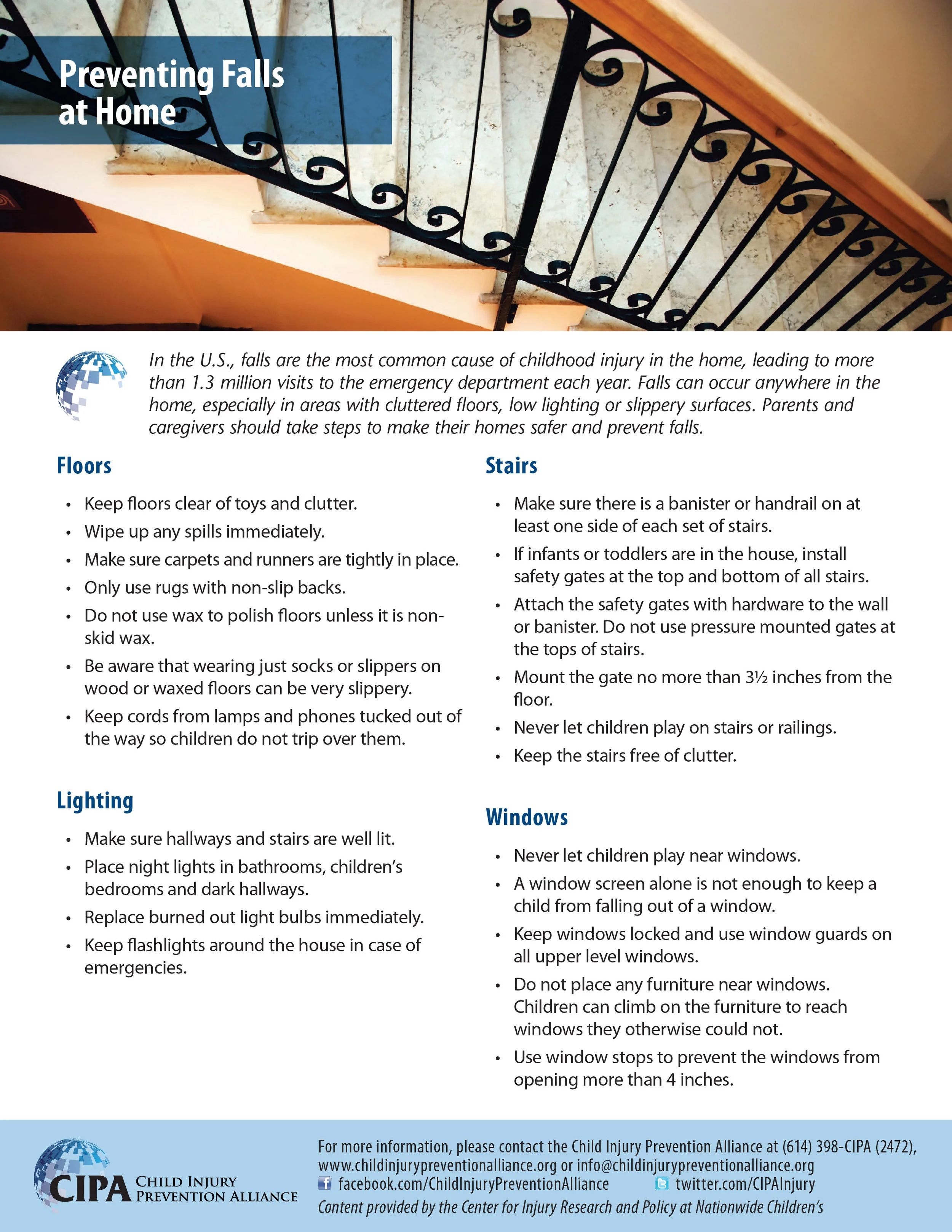 In the U.S., falls are the most common cause of childhood injury in the home, leading to more than 1.3 million visits to the emergency department each year. Falls can occur anywhere in the home, especially in areas with cluttered floors, low lighting or slippery surfaces.